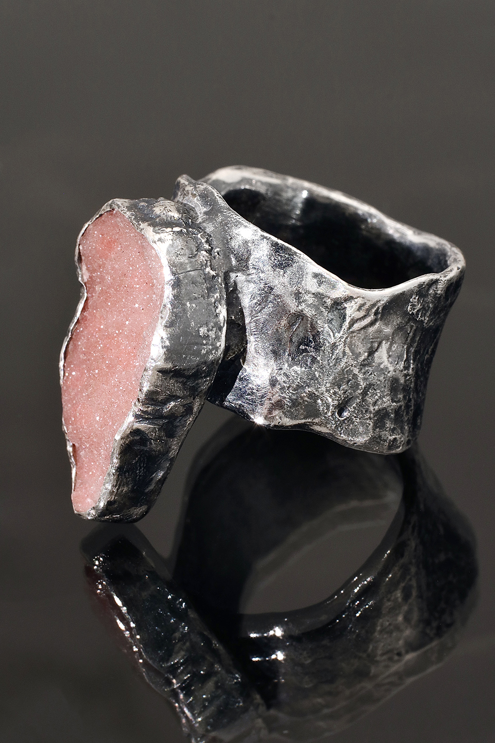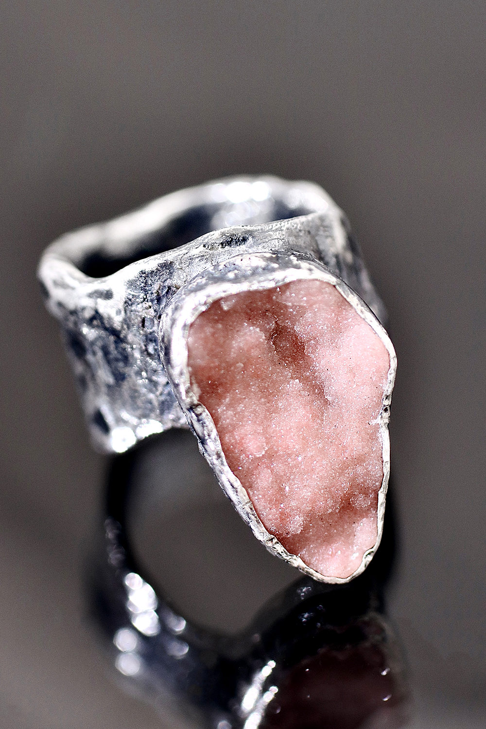 A natural amethyst druzy is set in a wild sterling silver ring with ripples, waves and rocky textures. Oxidized for a dark patina. One of a kind. Handcrafted by the artist, Miche McClendon, in her Laguna Beach studio gallery. Signed on bottom of band with a handmade custom crescent moon stamp.