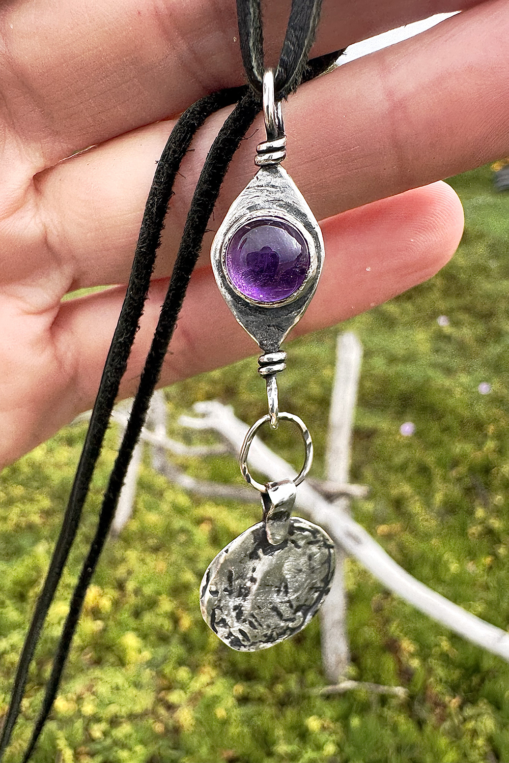 A round amethyst amulet with twisted wire bails has an ancient style coin with wave patterns hanging from it. Oxidized for some dark patina. On a soft black suede leather ribbon necklace with handmade silver bead on the ends that can be tied at different lengths. One of a kind. Fabricated from sterling silver by the artist, Miche McClendon, in her Laguna Beach studio gallery. Signed on the back with a custom crescent moon stamp.