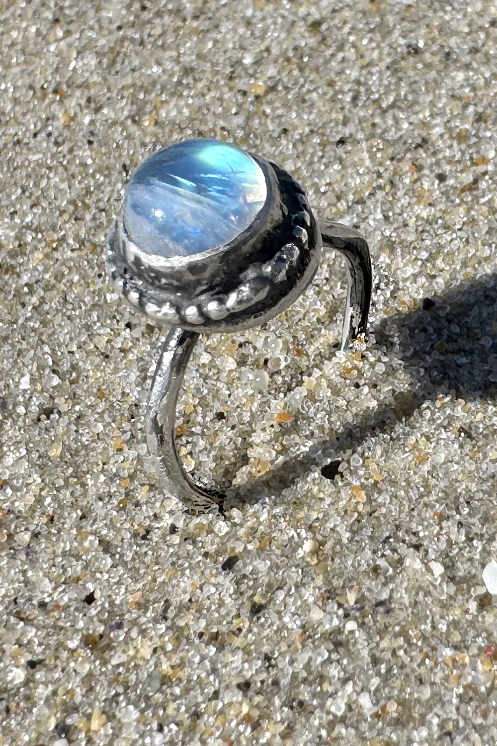 A striking round rainbow moonstone is set in sterling silver ancient ring with beaded pattern around it. The brilliant clear to white cloud gem has electric blue to rainbow shine or labradorescence in light. Oxidized and rubbed back for a dark patina in recesses. One of a kind. Signed on the side of the band with a handmade custom crescent moon stamp. Handcrafted by the artist, Miche McClendon, in her Laguna Beach studio gallery.