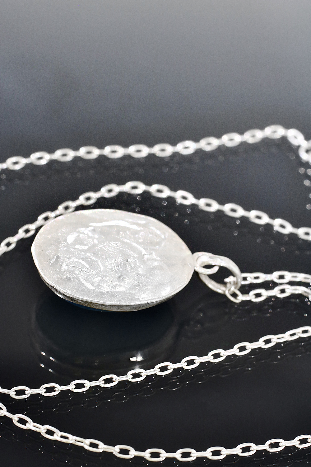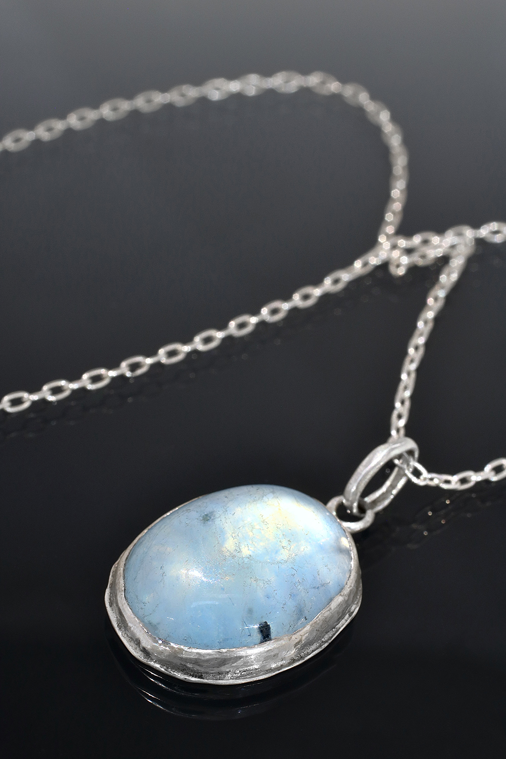 A super bright glowing aquamarine oval cabochon is bezel set in this sweet pendant necklace. On a short oval link cable chain necklace with S hook clasp to secure. Stamped on the back with a handmade crescent moon stamp signature. One of a kind. Handcrafted in bright shiny sterling silver by the artist, Miche McClendon, in her Laguna Beach studio gallery.