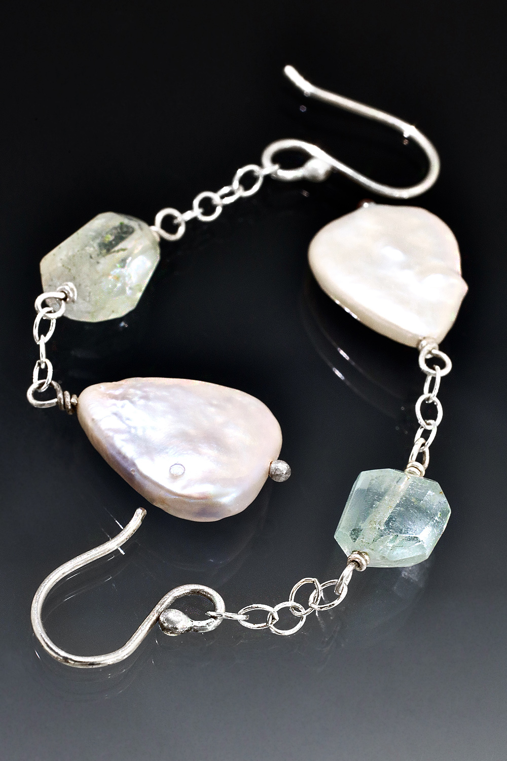 Graceful long swingy sterling silver earrings have freshwater pearl drops wire wrapped at the ends and faceted pale blue aquamarine beads in the middles. On French hook ear wire with ball details. One of a kind. Handcrafted by the artist, Miche McClendon, in her Laguna Beach studio gallery.