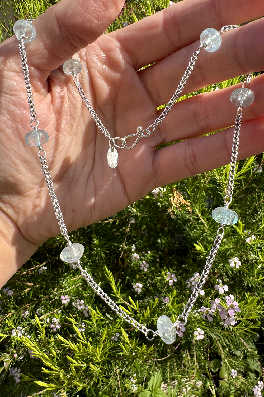 This ancient style loop in loop hand woven chain necklace has wire wrapped pale blue topaz beads. Bright shiny sterling silver. Secures with a Shepard hook clasp. A little oval tag is signed with a handmade crescent moon stamp. One of a kind. Handcrafted by the artist, Miche McClendon, in her Laguna Beach studio gallery.