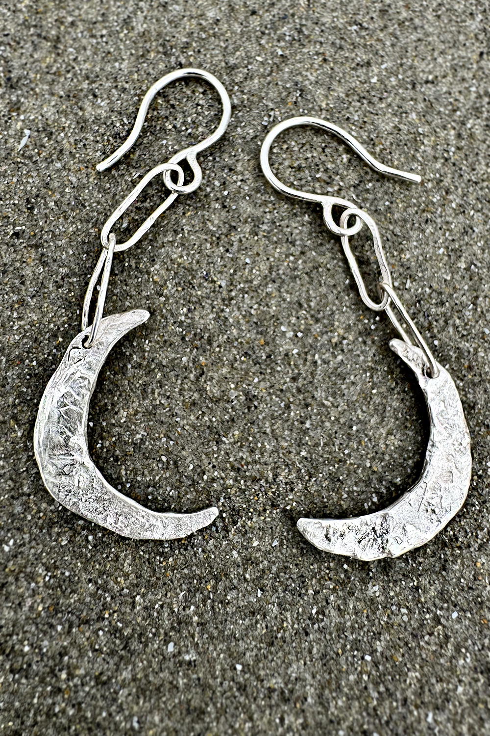 Unique organic shaped crescent moon charms swing on long hammered chain link earrings. The moons are reticulated sterling silver which means the metal was heated unevenly causing unique buckled patterns. On French hook ear wires. One of a kind. Handcrafted in bright shiny sterling silver by the artist, Miche McClendon, in her Laguna Beach studio gallery. Signed on the backs with a tiny handmade custom crescent moon stamp.