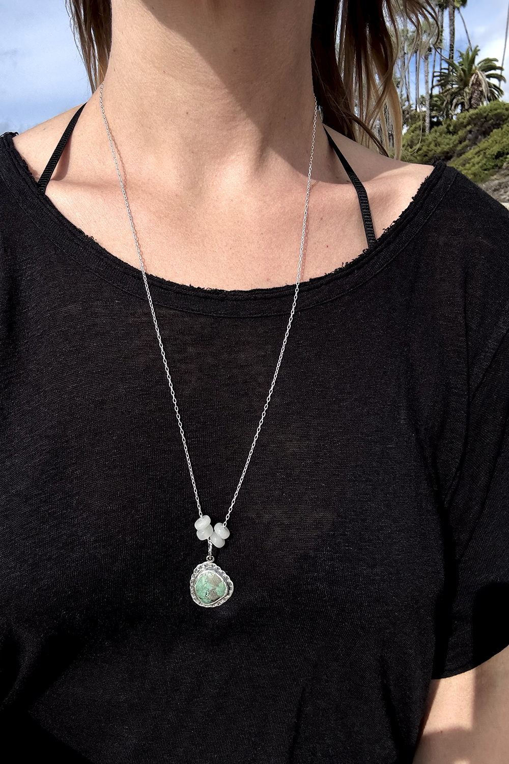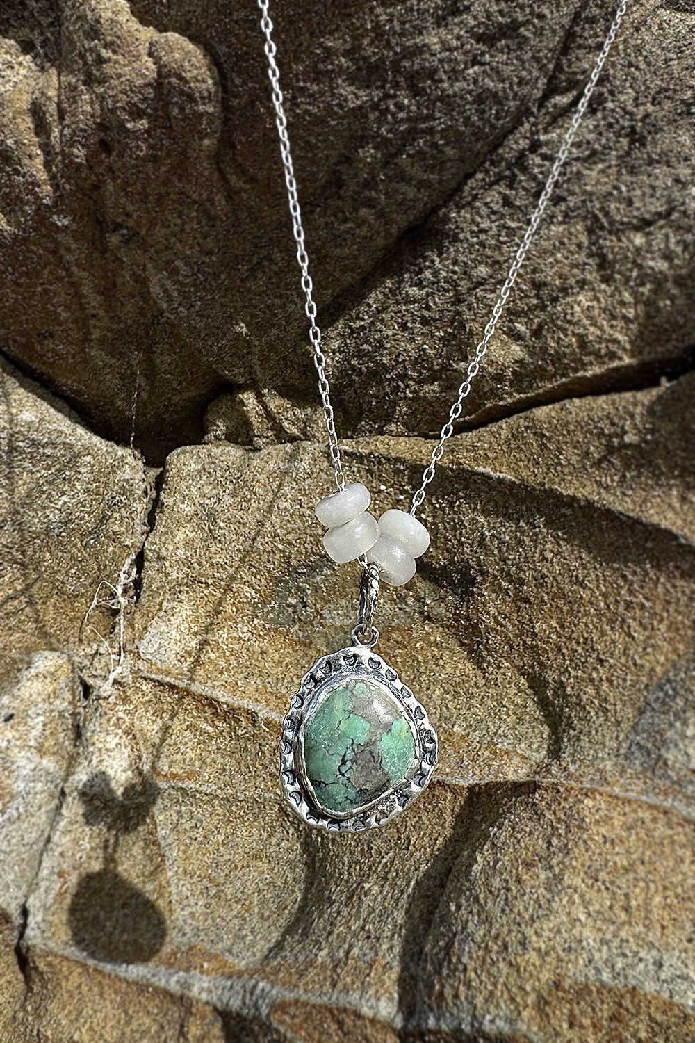 A beautiful free form pale turquoise with light gray speckled matrix is set in a pendant necklace with crescent moons stamped in a halo around it. This mysterious piece hangs on a twisted wire bail on a long cable chain necklace with four soft white glowy moonstone beads. Oxidized and rubbed back for dark patina in the recesses. One of a kind. Hand crafted by the artist, Miche McClendon, in her Laguna Beach studio gallery. Stamped on the back with a handmade crescent moon stamp for signature.
