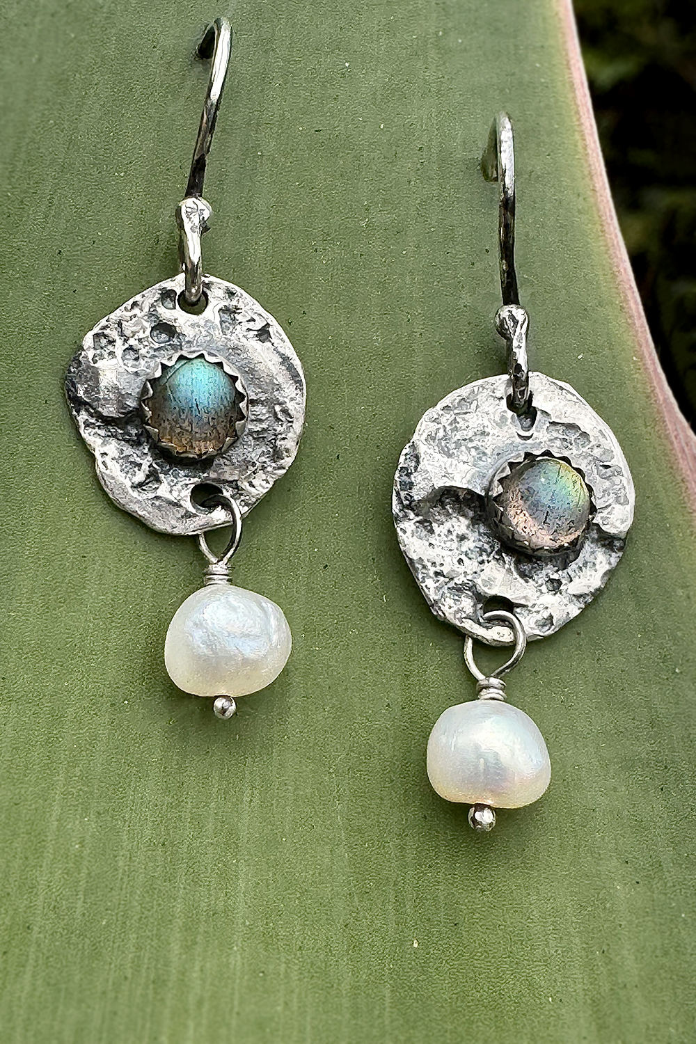 Hand fabricated little sterling silver coins have labradorite bezel set in them and white freshwater pearls hanging from them. On French hook ear wires with dot details. One of a kind. Handcrafted by the artist, Miche McClendon, in her Laguna Beach studio gallery. Signed with a handmade custom crescent moon stamp on the backs.