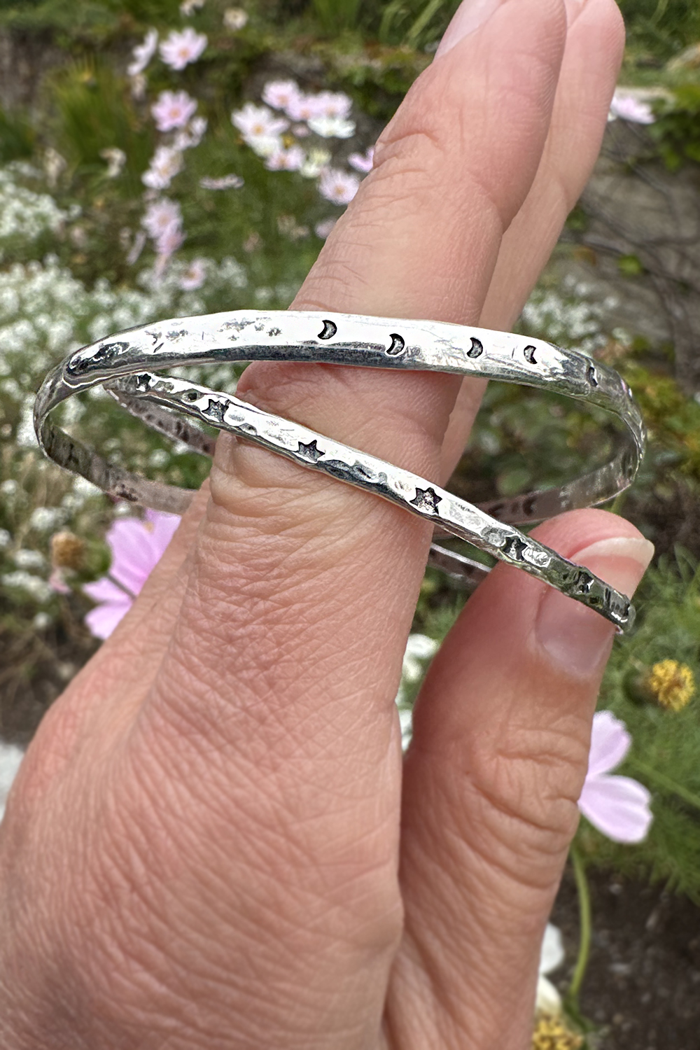 A hand fabricated round sterling silver bangle bracelet with hammered texture has groups of crescent moons stamped into it with spaces between. Beautiful to wear alone or stacked with more bracelets. One of a kind. Handcrafted by the artist, Miche McClendon, in her Laguna Beach studio gallery. Oxidized and rubbed back for a dark patina in recesses. Signed with a handmade custom crescent moon stamp.