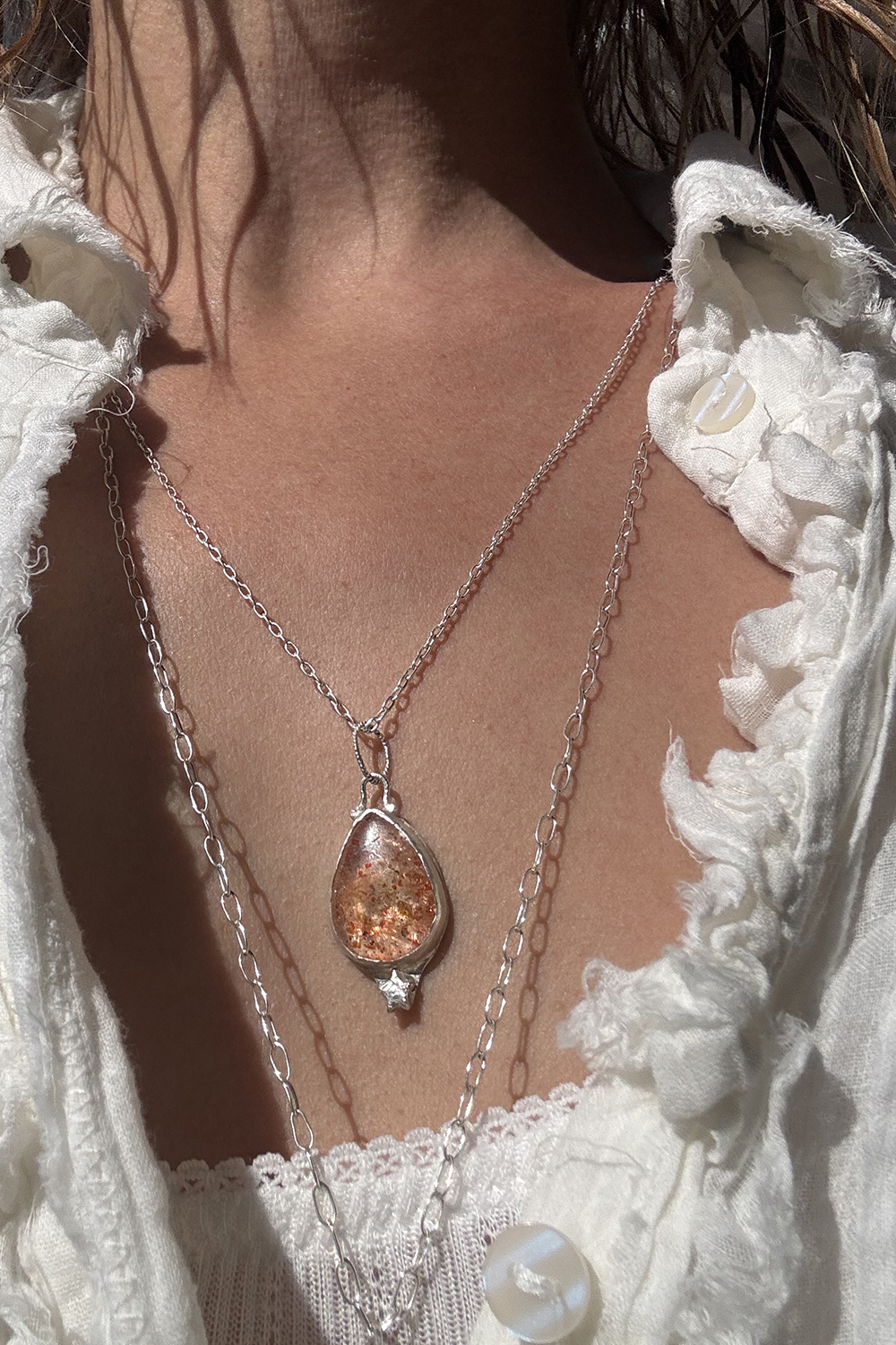 A stunning sunstone drop is bezel set in an organic shaped pendant necklace with a five point star. The orange and clear gem has brilliant rainbow confetti that flashes in light. A decorative bail has dot details and twisted wire ring. On a long oval link cable chain necklace with an S hook clasp. Handcrafted in bright shiny sterling silver by the artist, Miche McClendon, in her Laguna Beach studio gallery. Signed with a handmade custom crescent moon stamp on the back. One of a kind.