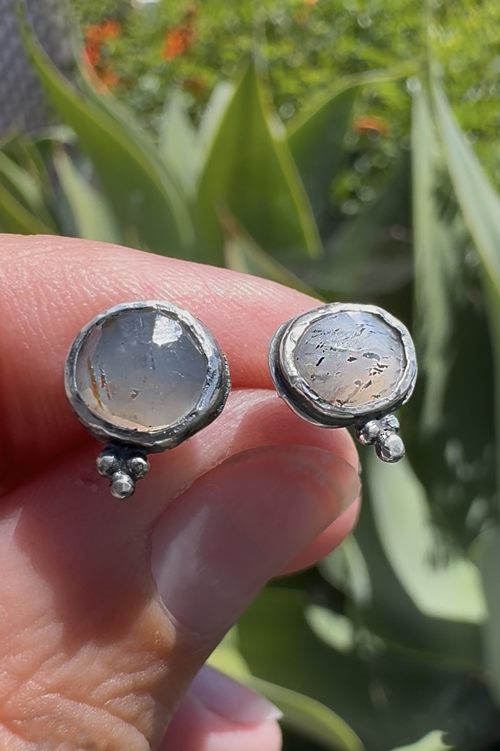 Reflective glowing gray rosecut moonstones are set in rustic stud earrings with granulation details. Post style with push backings. One of a kind. Handcrafted in sterling silver by the artist, Miche McClendon, in her Laguna Beach studio gallery. Oxidized and rubbed back for dark patina in the recesses. Signed on the backs with a tiny handmade custom crescent moon stamp.