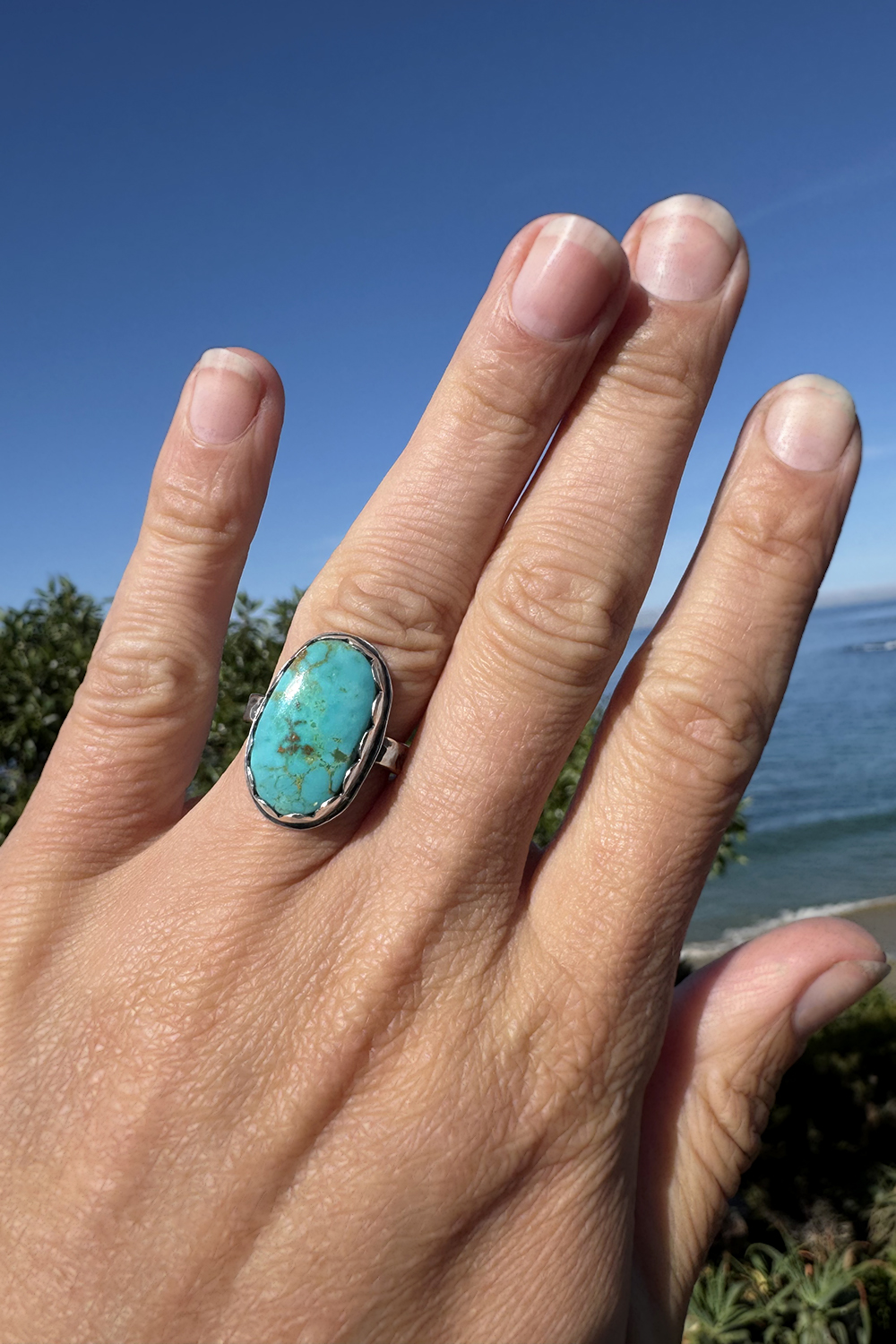A bright oval of Royston turquoise is held in a scalloped bezel on a ring with moons stamped around the band. The gem is robins egg blue green with pale to tan swirling matrix perfectly balanced. Created in sterling silver by the artist, Miche McClendon, in her Laguna Beach studio gallery. Oxidized for a dark patina with bright shiny highlights. One of a kind. Signed on the inside with a handmade custom crescent moon stamps.