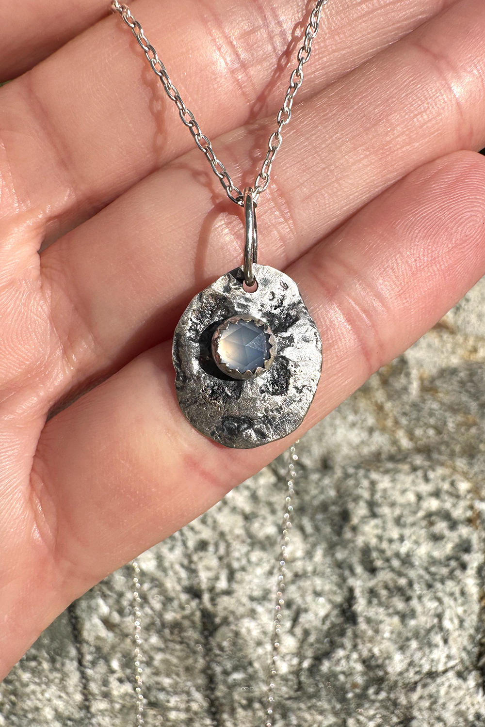 A rose cut pale blue chalcedony is held in this ancient style coin pendant necklace. Handcrafted in sterling silver by the artist, Miche McClendon, in her Laguna Beach studio gallery. Oxidized for some dark patina. Signed inside with a handmade custom crescent moon stamp. One of a kind.