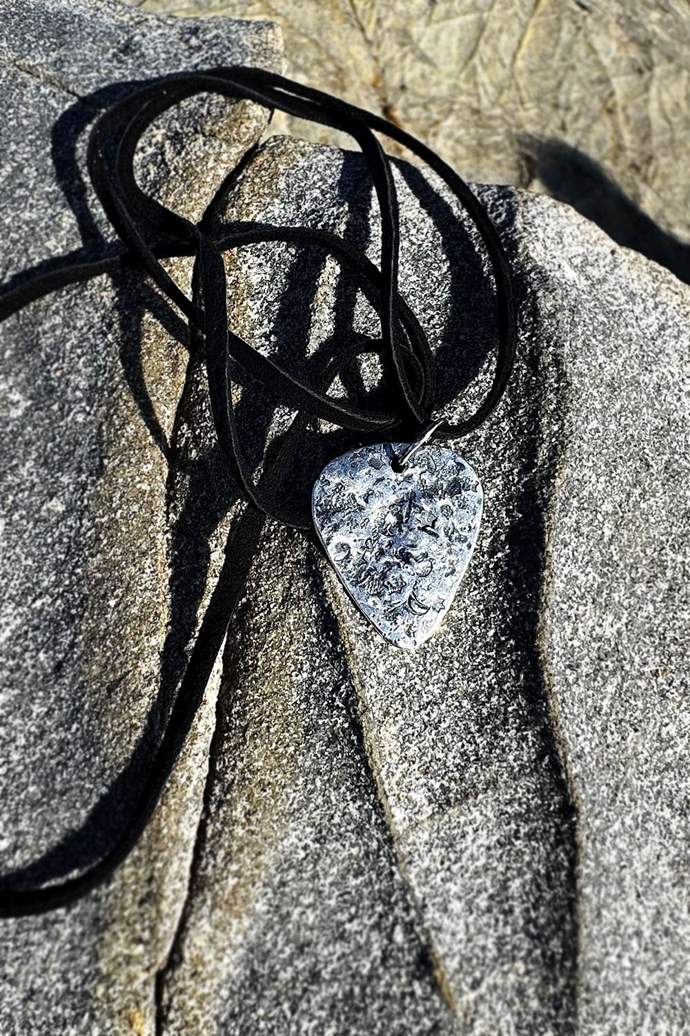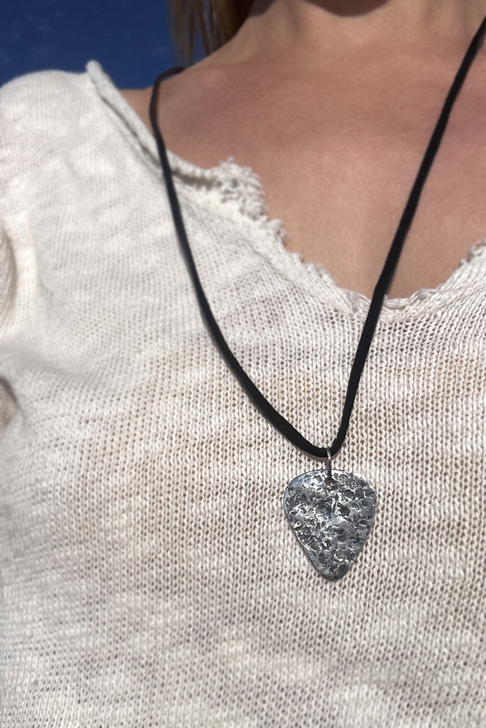 A rustic sterling silver guitar pick is hammered and stamped with many different textures to create a spacey cosmos effect. Oxidized for a dark patina with highlights. Handcrafted by the artist, Miche McClendon, in her Laguna Beach studio gallery. Signed with a handmade custom crescent moon stamp. On a soft supple black suede leather ribbon necklace that can be tied at different lengths. One of a kind.