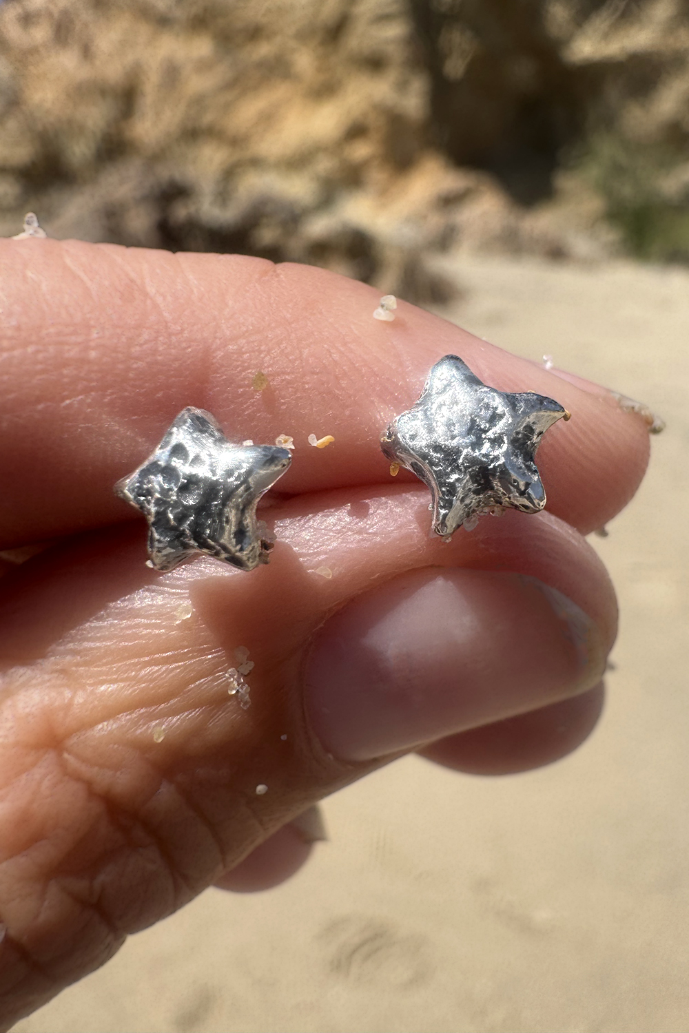 Sterling silver hammered hoop earrings have a star pattern encircling them and organic shaping. Oxidized and rubbed back for a dark patina with highlights. One of a kind. Post style with push backings. Handcrafted by the artist, Miche McClendon, in her Laguna Beach studio gallery. Signed with a tiny handmade crescent moon stamp.