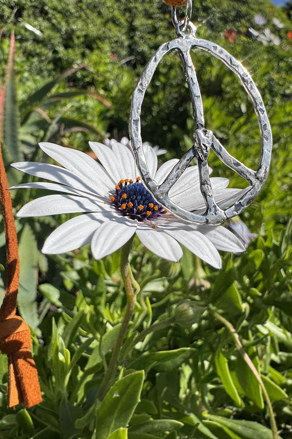A sculptural peace sign pendant necklace has a little heart in the middle. Organic textures come from being fabricated, hammered and forged in sterling silver. Oxidized and rubbed back for a dark patina in recesses. On a long supple saddle brown suede leather ribbon necklace that can be tied at different lengths. One of a kind. Handcrafted in sterling silver by the artist, Miche McClendon, in her Laguna Beach studio gallery. Signed on the back of with a tiny handmade custom crescent moon stamp.