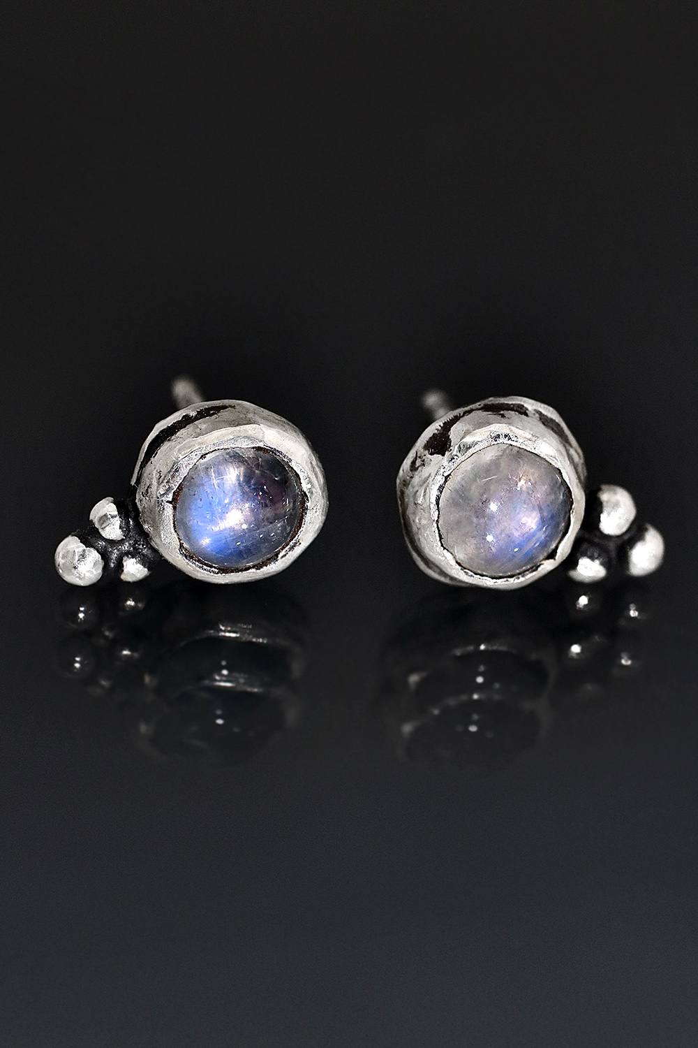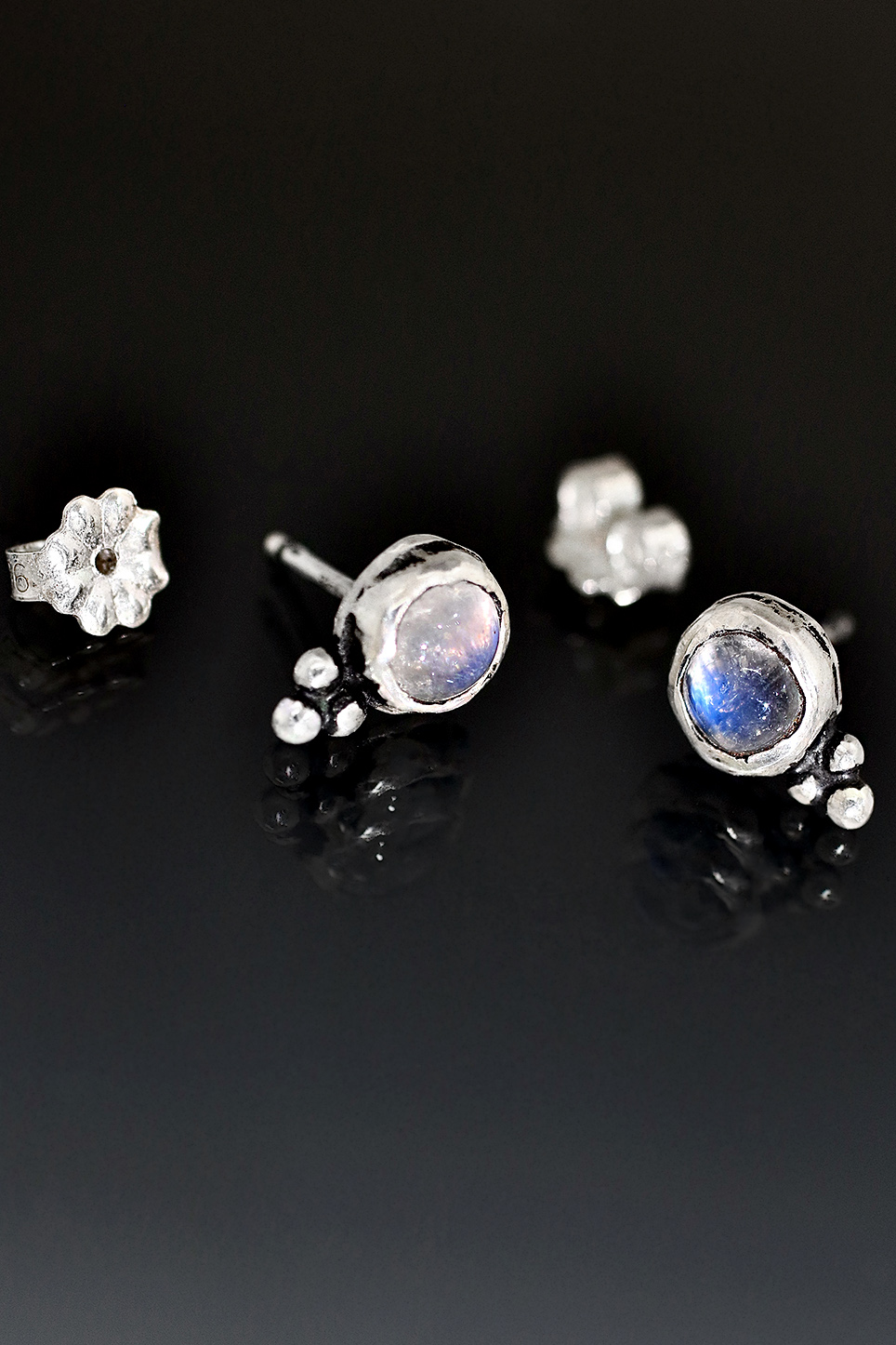 Super glowy rainbow moonstone stud earrings have dot granulation details below and rustic shaping. Post style with push backings. One of a kind. Handcrafted in sterling silver by the artist, Miche McClendon, in her Laguna Beach studio gallery. Oxidized and rubbed back for dark patina in the recesses. Signed on the backs with a tiny handmade custom crescent moon stamp.