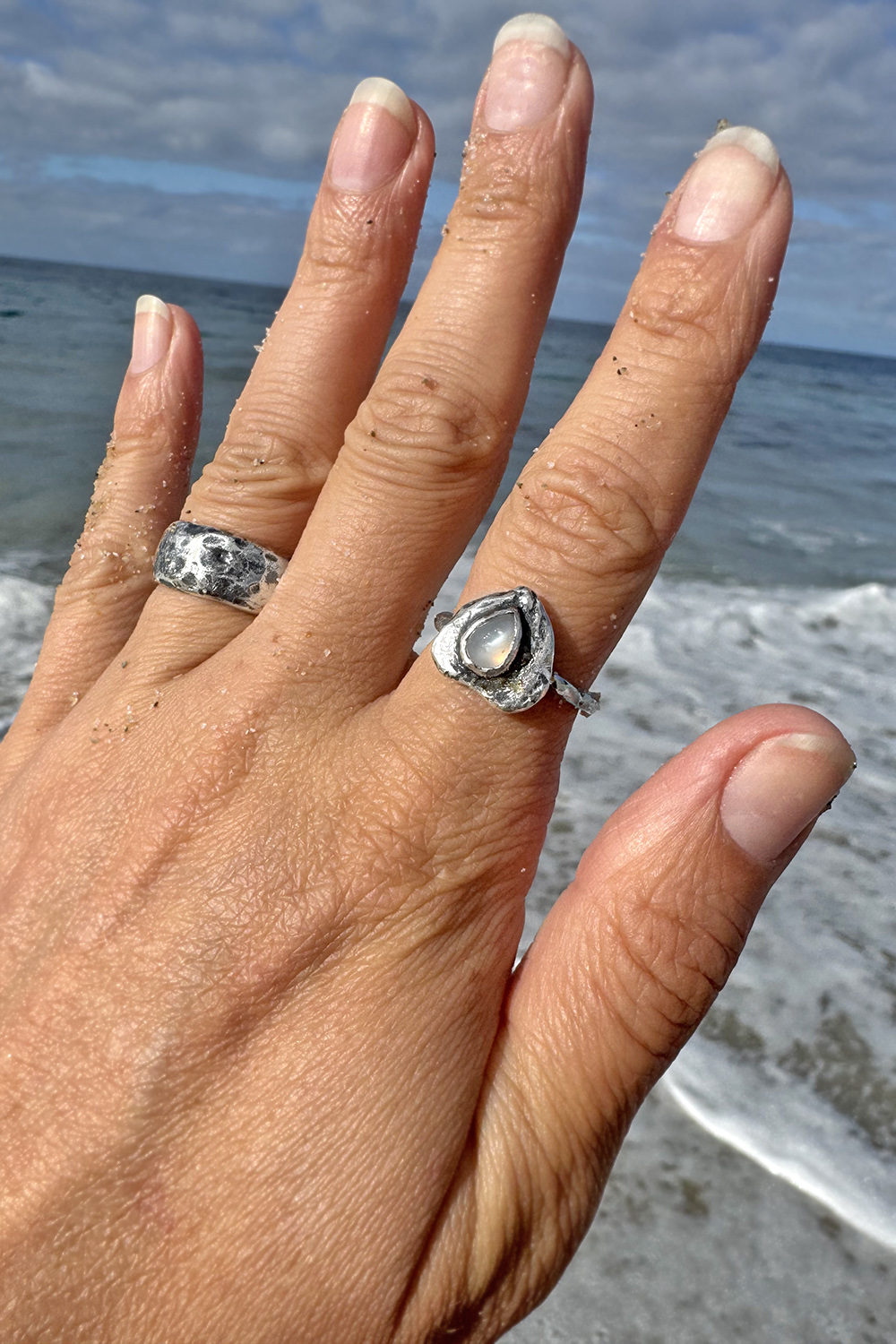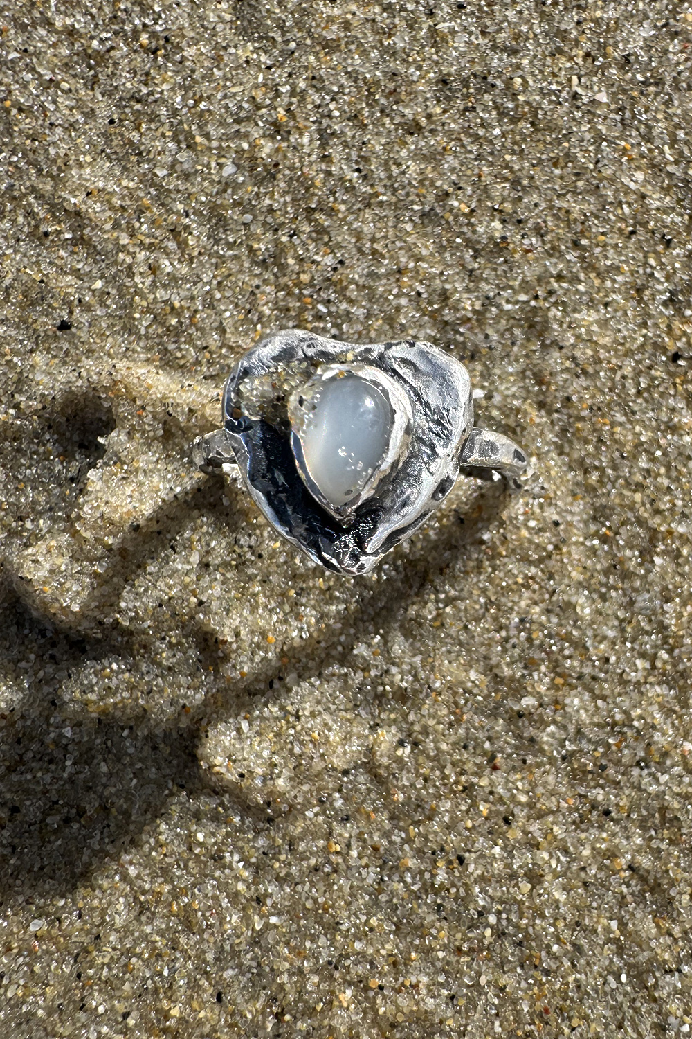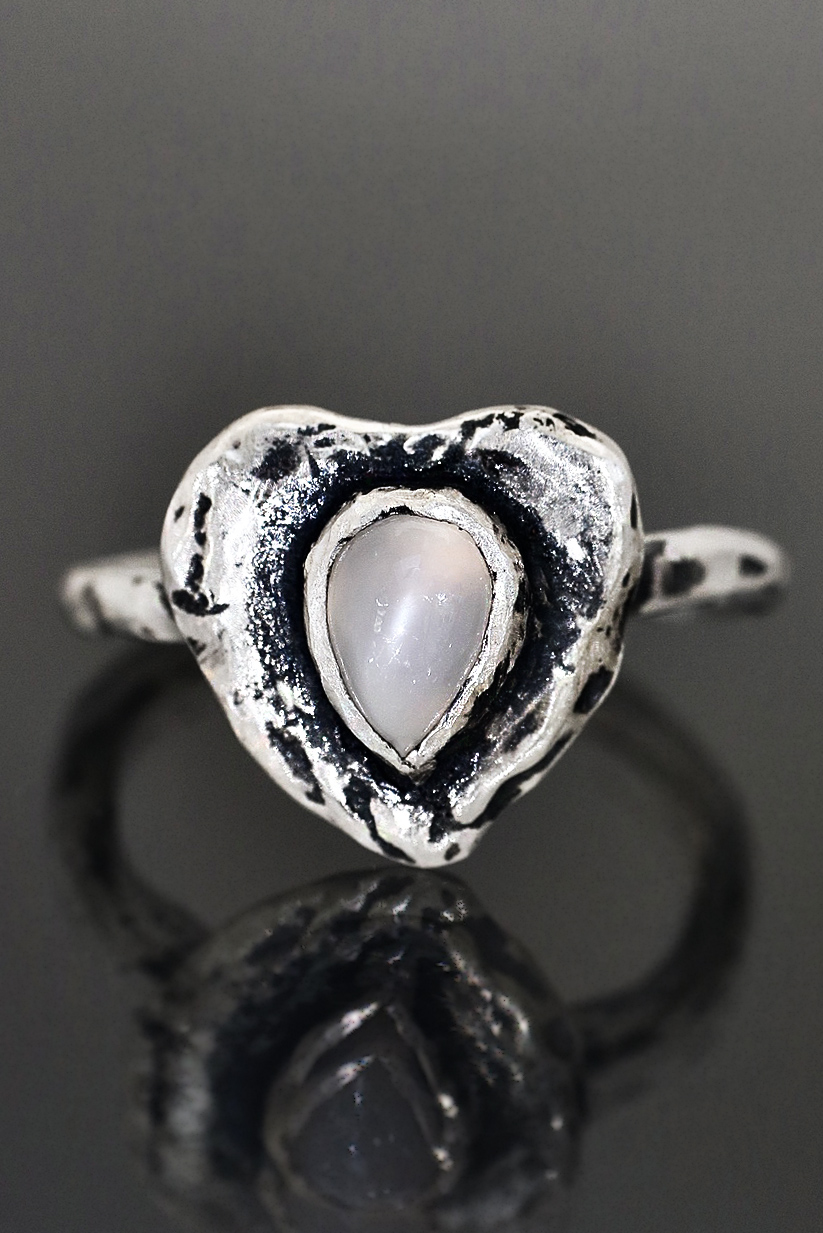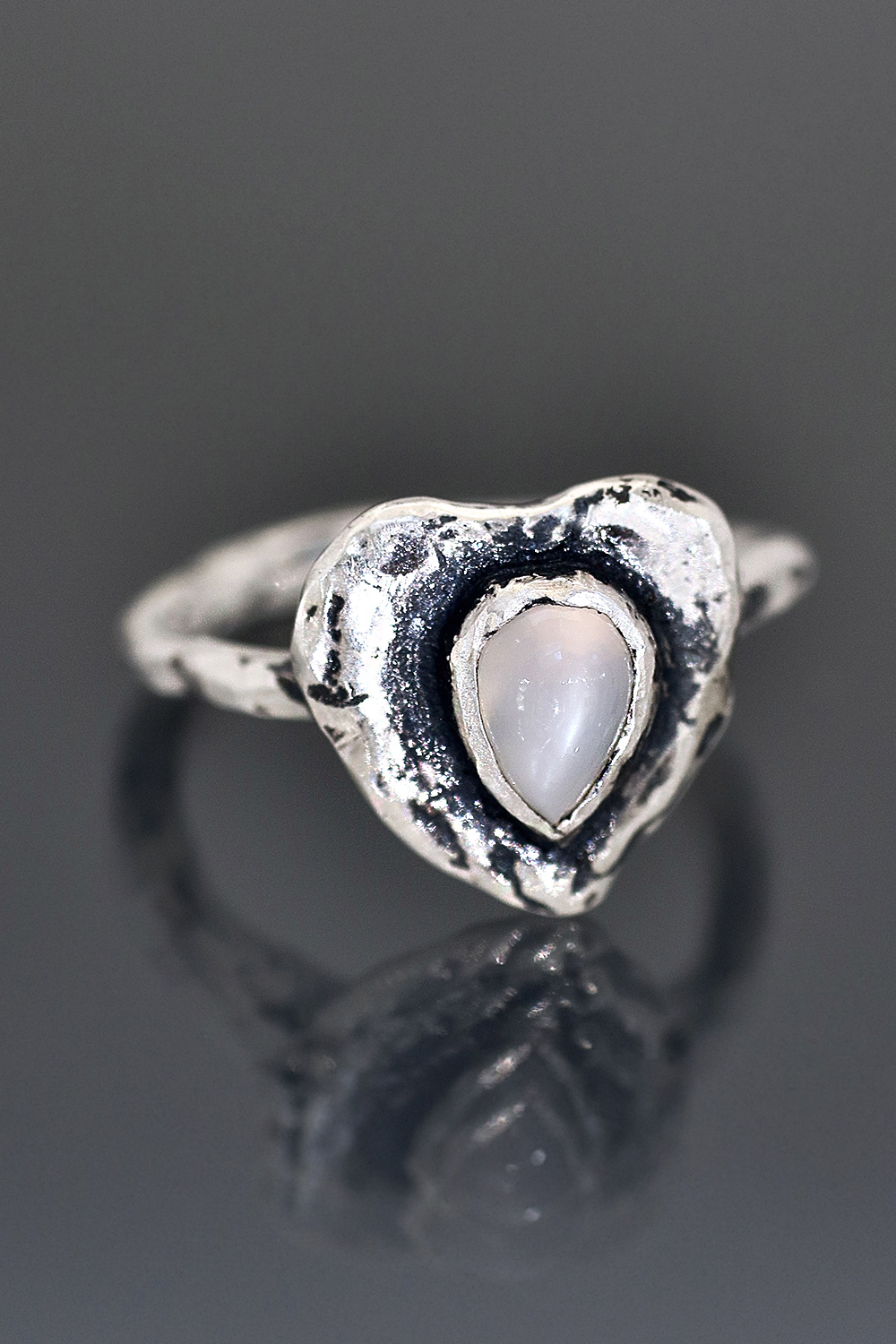 A rustic heart sits atop a delicate ring band and has a white moonstone drop bezel set on it. The gem is glowy and misty magic white. Ancient textures and polishing make this piece appear time worn. Oxidized and rubbed back for a little dark patina. Handcrafted in sterling silver by the artist, Miche McClendon, in her Laguna Beach studio gallery. One of a kind. Signed with a handmade custom crescent moon stamp on the bottom of the setting.